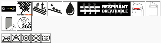 Matière principale : 94% Polyester / 6% Elasthanne – 300g/m² – SOFTSHELL